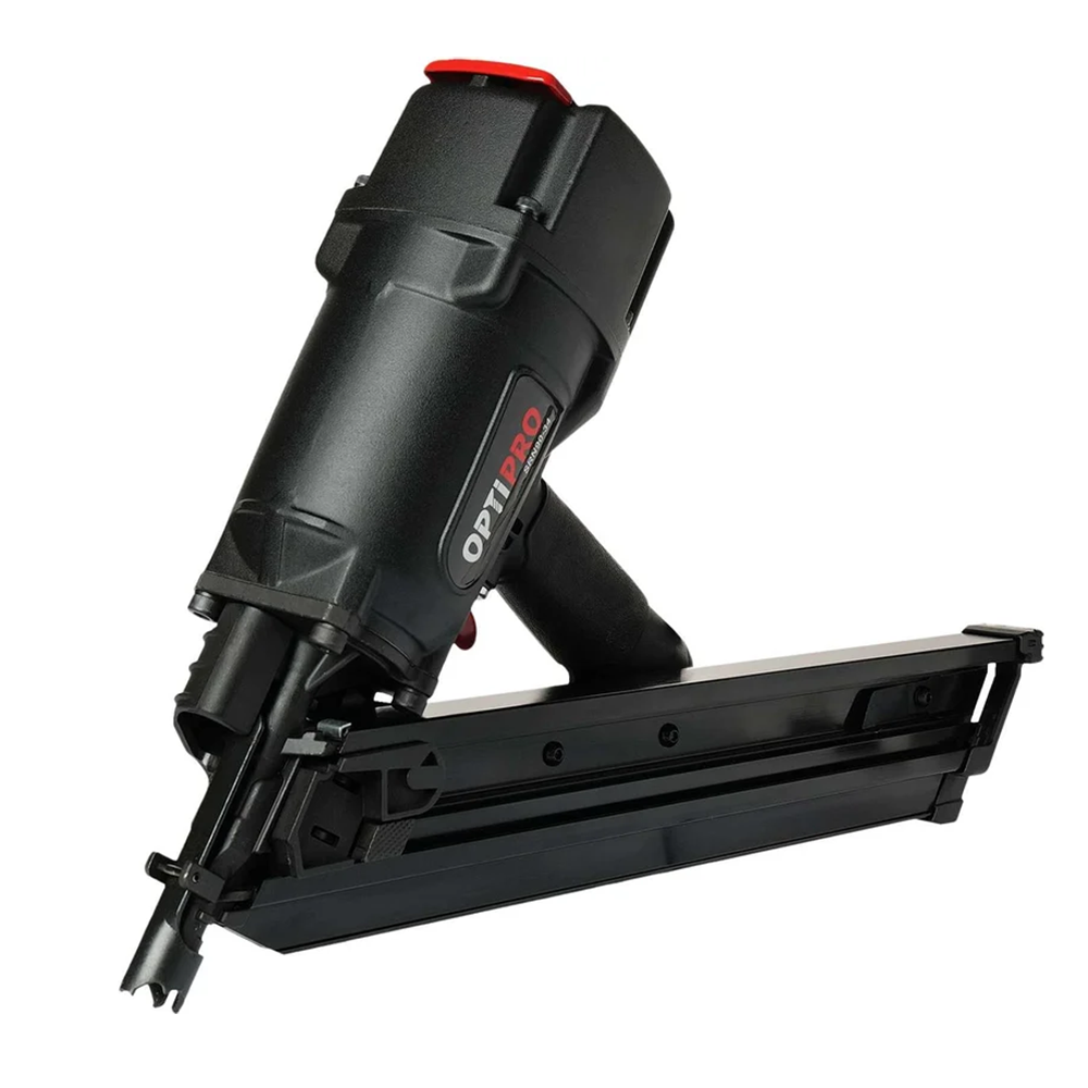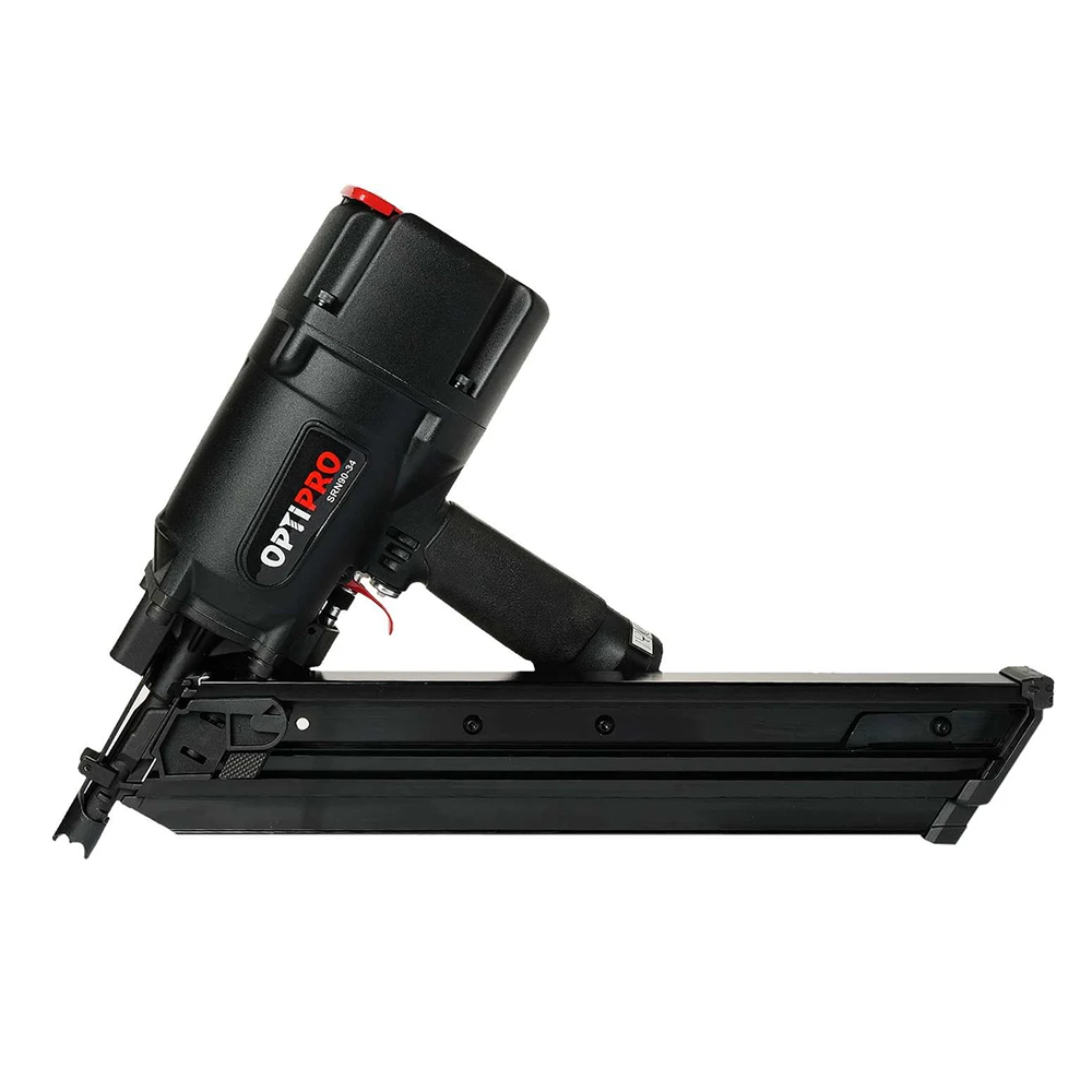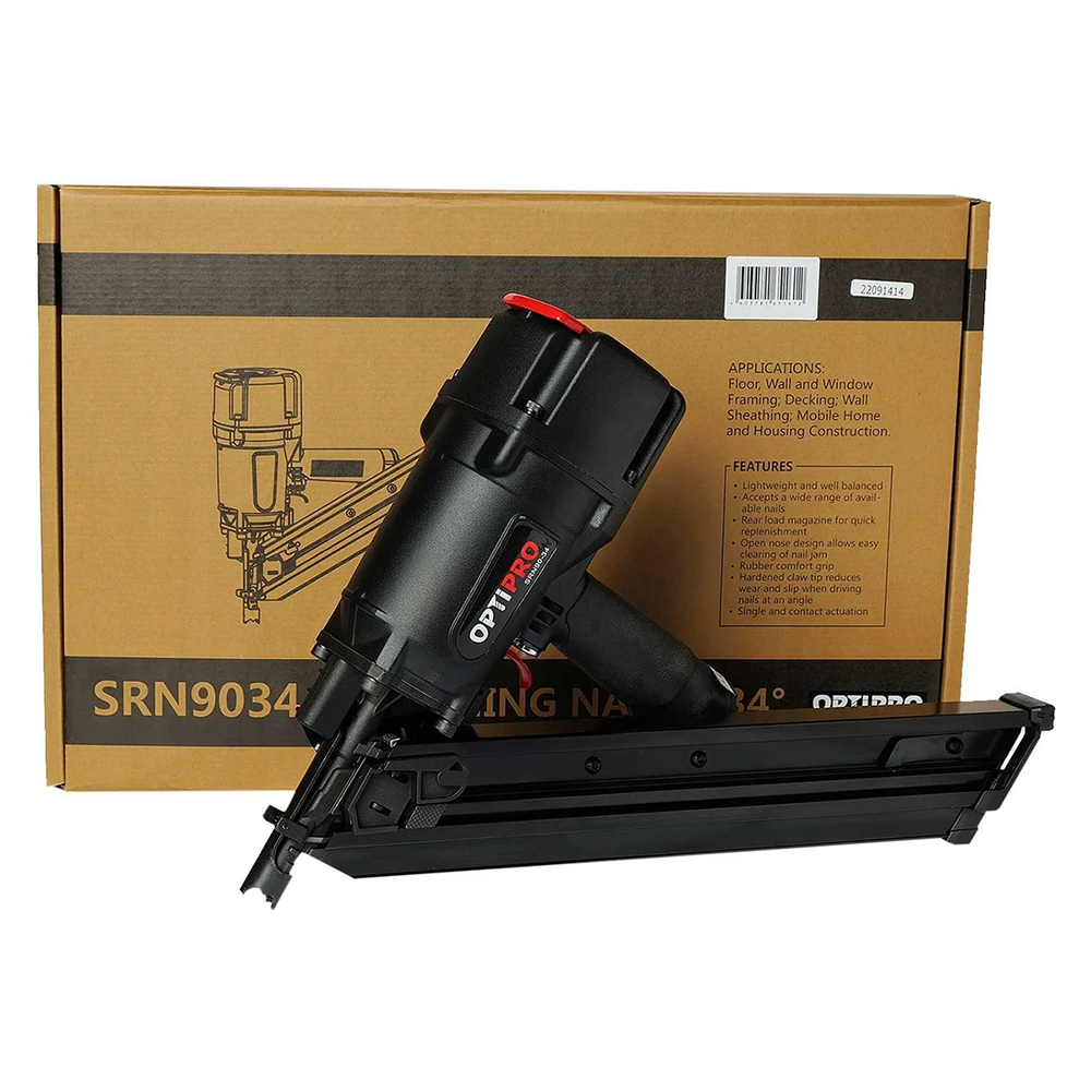 Гвоздезабивной пистолет Optipro SRN9034 предназначен для работ по дереву при сборке каркасов, обрешетки и креплении грузов и общестроительных работ. Бьет реечными гвоздями в бумажной обойме с D-образной шляпкой (тип D34) с углом наклона 34° , длиной от 50 до 90 мм.