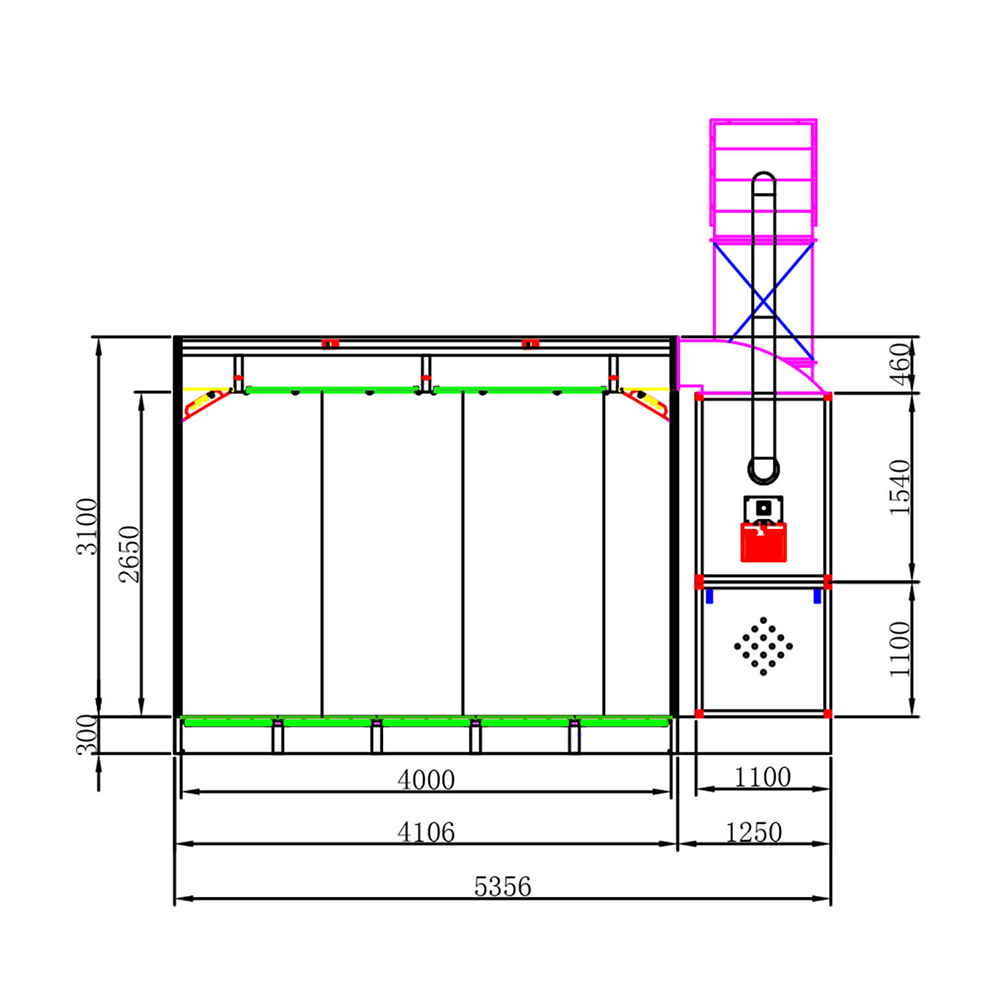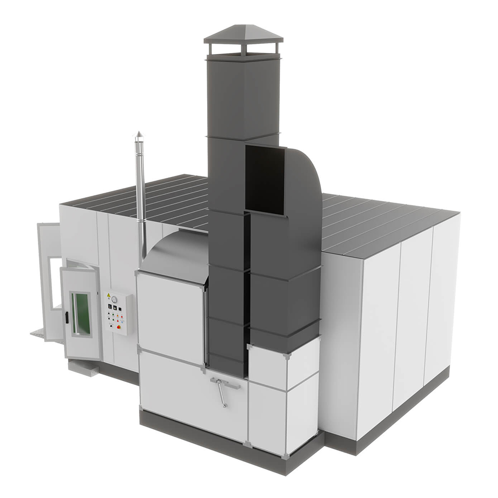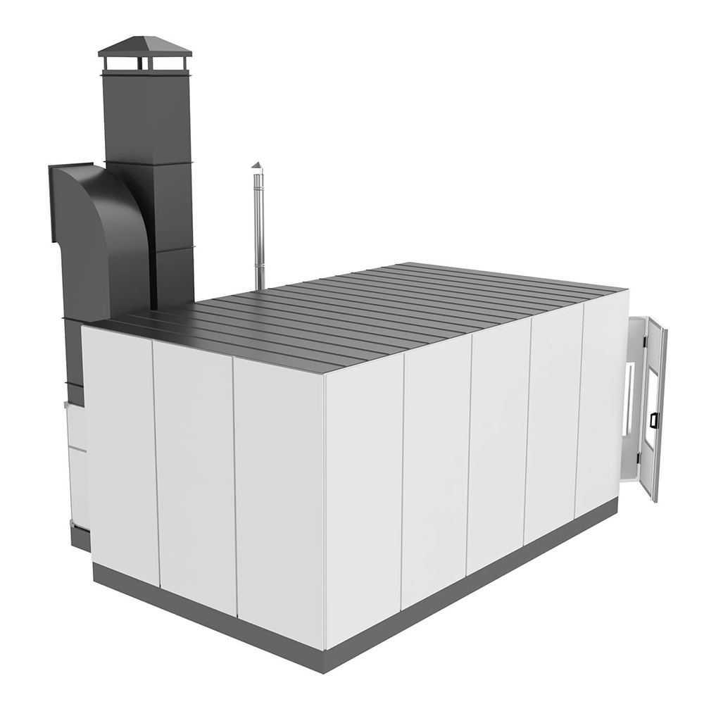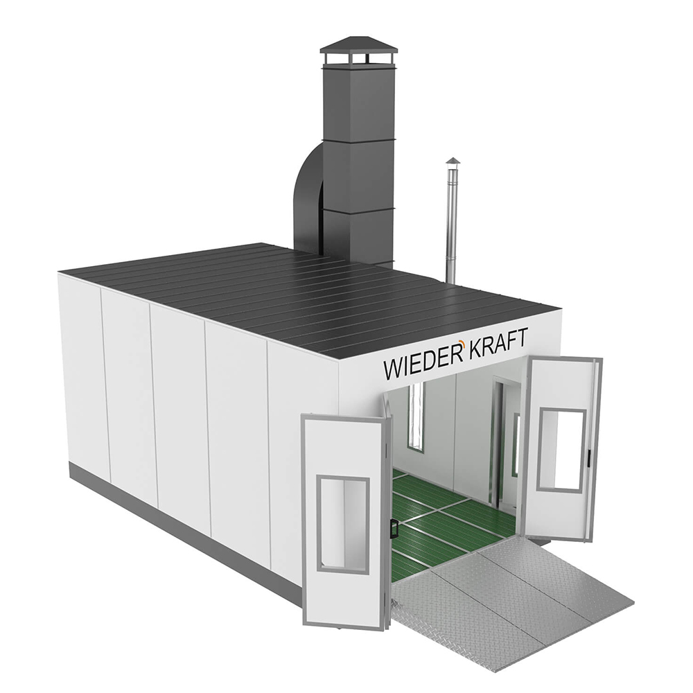WDK-210 - окрасочно-сушильная камера с дизельной горелкой Riello и приточно-вытяжным тепловентиляционным агрегатом. Используется для сушки лакокрасочных покрытий и организации технологических процессов окраски. Боковые стены состоят из сэндвич-панелей (негорючий пенополистирол толщиной 53 мм) и являются теплоизоляционными. Визуальный контроль позволяют осуществить 3-х створчатые ворота со встроенными смотровыми окнами. Можно установить дополнительный комплект ворот с целью организации сквозного проезда. Установить приточно-вытяжную группу с любой стороны в процессе монтажа позволяет унифицированная конструкция.