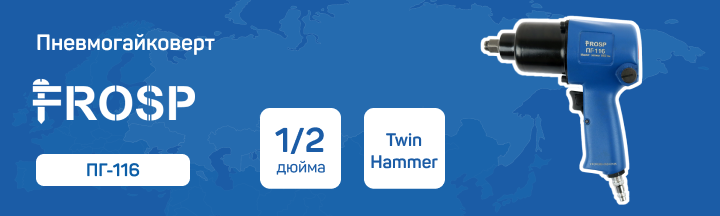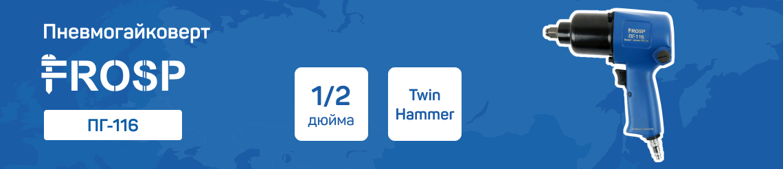Модель FROSP ПГ-116 имеет квадрат шпинделя 1/2 дюйма. Есть функция реверса, а также регулировки момента затяжки. Этот пневмогайковерт можно назвать самым популярным в своем сегменте. Он сочетает в себе стабильную работу, длительный срок эксплуатации, доступную цену.